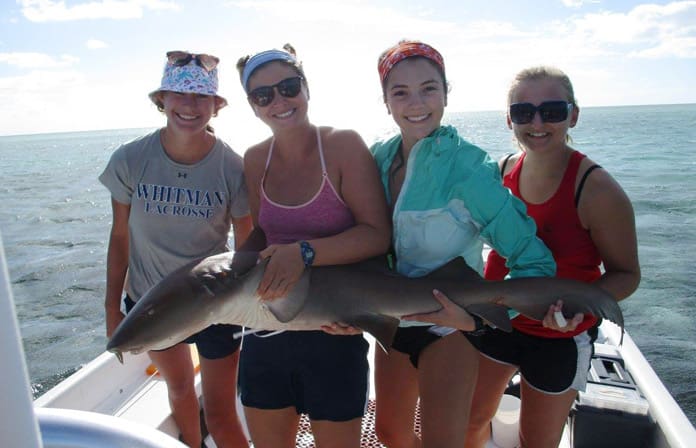 “We used a drumline system to hook a shark then tied it to the side of a 24-foot boat to measure and tag. We took the total length (from the tip of the head to the tip of the tail) and clasper length if the shark was male. We inserted a PIT tag, the equivalent of a chip in domestic dogs, and a hard external tag with a number for identification purposes. We took a tissue, blood, and sperm sample. Finally, we would release the shark from the boat and watch it swim away to ensure it was moving properly.”