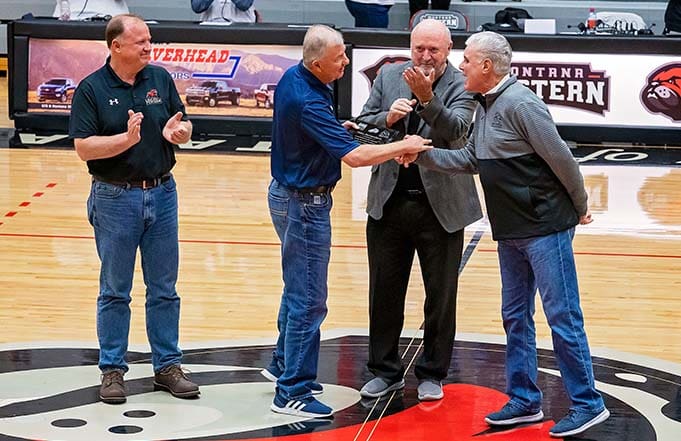 Mike Richardson, longtime Frontier Conference basketball and football official was honored Saturday, Dec. 4, 2021 in Dillon, Mont. prior to the Montana Western-Carroll College men’s basketball game.