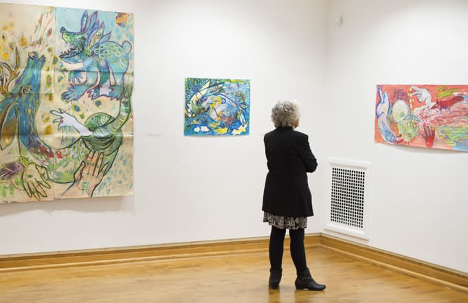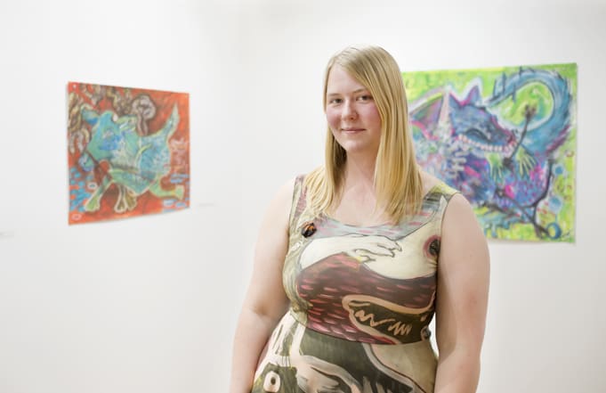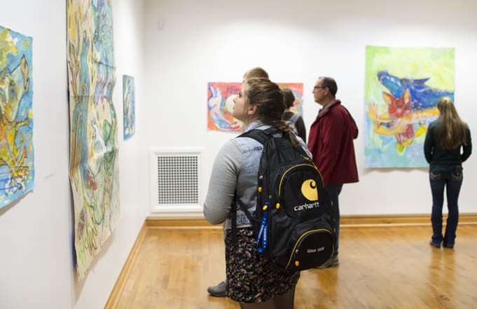 Huhtala’s vibrantly colored mixed media pieces are rich with symbolism, which the artist was excited to share with the audience before the opening celebration of her exhibit in the University of Montana Western Fine Arts Gallery.