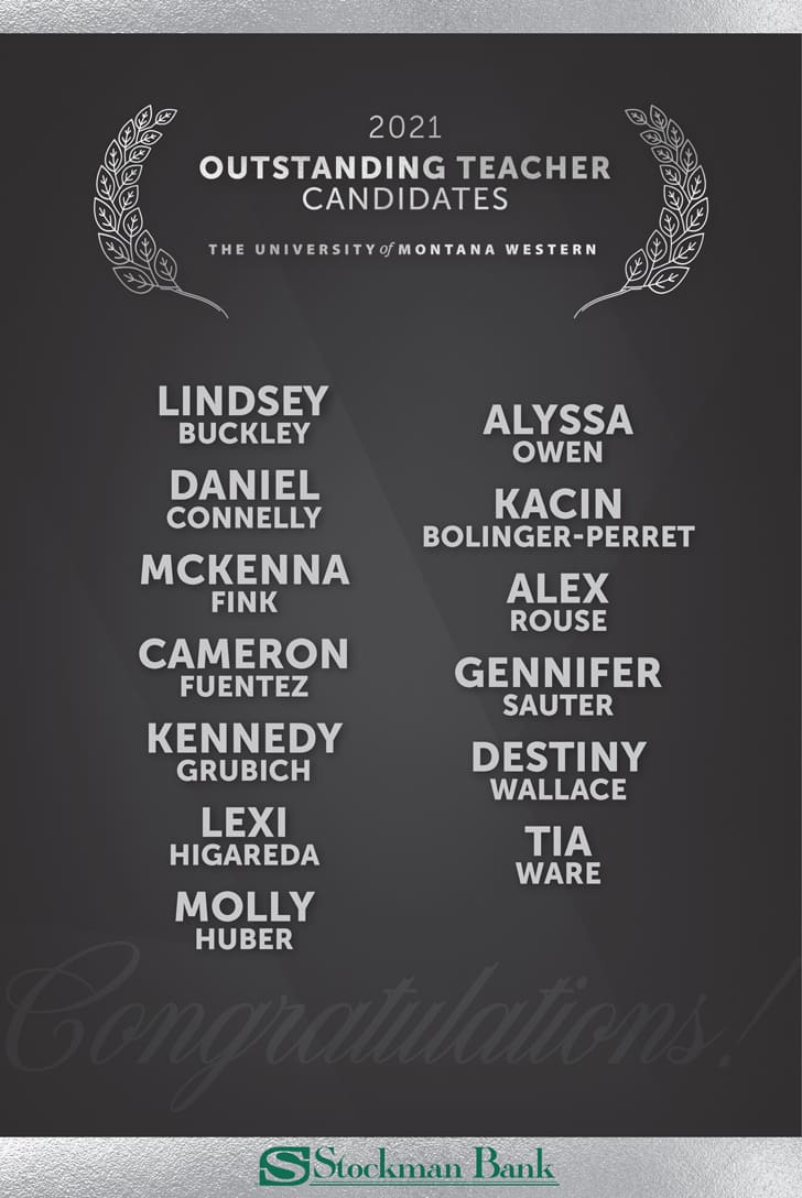 The University of Montana Western and Stockman Bank recognized the 2021 Outstanding Teacher Candidates at Commencement earlier this spring. These inspiring UMW graduating seniors will be teaching and enriching their communities this fall.
