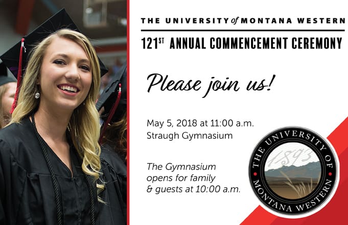 University of Montana Western Chancellor Beth Weatherby announced that the University’s 121st Annual Commencement will take place Saturday, May 5, 2018. The ceremony will begin at 11:00 a.m. in the Straugh Gymnasium on the Montana Western campus.