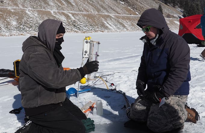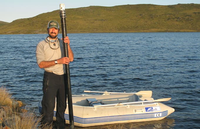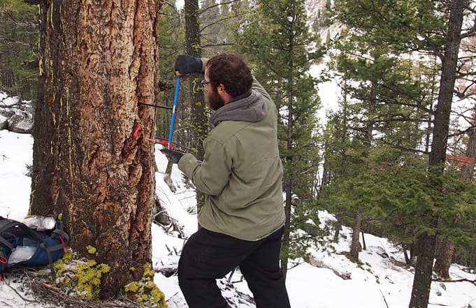 The existing data of tree rings goes back approximately 1,000 years. Schoenemann and his collaborators, Dr. Greg Pederson (USGS) and Dr. Dave McWethy and Justin Martin (Montana State University), as well as students from the University of Montana Western, will assist in the collection of core samples taken from alpine lakes in Southwestern Montana. They will then analyze the sediment samples for oxygen isotopes (δ18O), which record variations in the lake water driven by runoff from snowpack over decadal timespans. The colder the winter and the more snowpack that was present in a year, the more negative the oxygen isotope values, which are then precipitated as calcite in the sediments of the lakes. The isotopes remain in the lakebed sediments for thousands of years, and will be cross referenced with snowpack histories from the tree ring database, allowing for a viable snowpack and climate reconstruction to be generated covering multiple millenniums.