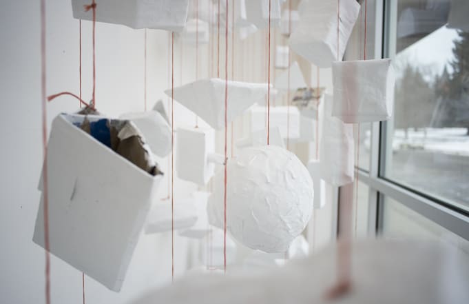 The students in the course also had the opportunity to decide how to hang the papier-mâché objects from the ceiling of the display. Several options including rope and wire were considered, but the students suggested using bailing twine. The twine also added an element of color to the installation, which provided a layer of interesting contrast to the white shapes.