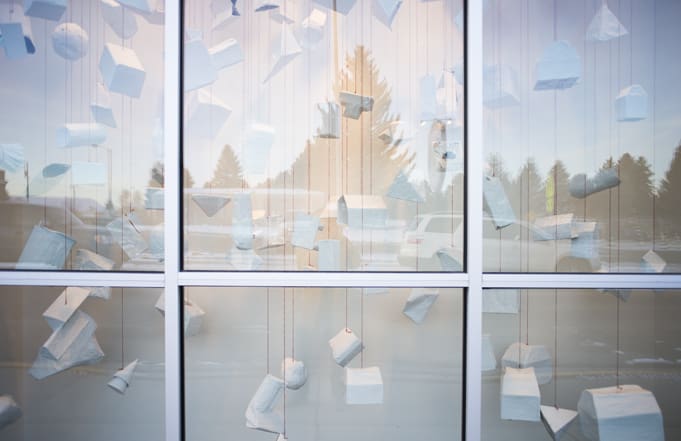 Students in the courses are from a variety of majors, and the “3-D Foundations” course culminated in a suspended installation in the window gallery of the Emerick Art Studio.