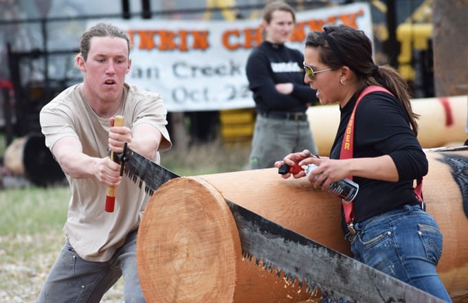 Timber, or logging, sports involve competitions that include chopping, sawing, and balancing on wood, both as individuals and teams.