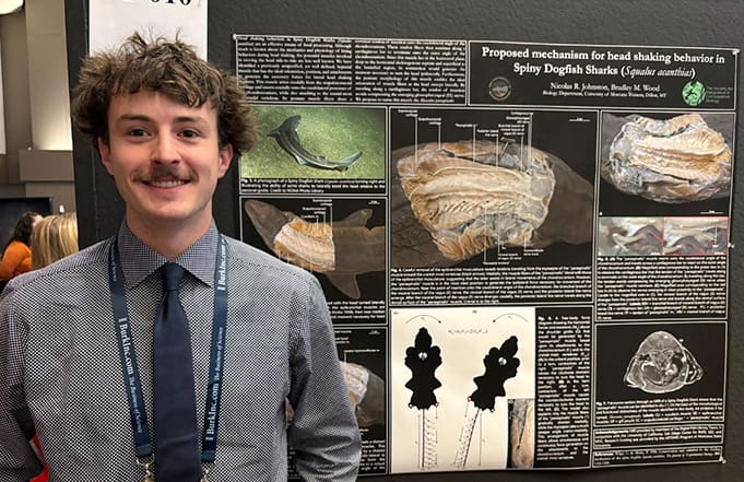 Despite never having seen the ocean, Cole’s research on sharks has provided important insight into how animals without a functional neck are able to move their heads during prey capture and processing. He presented his research at the 2025 national meeting of the Society of Integrative and Comparative Biology in Atlanta, GA, and at the annual UMW Undergraduate Research Symposium this May. He is currently working with Dr. Wood on a first-authored manuscript for publication in a scientific journal.