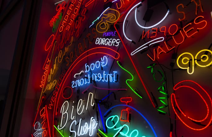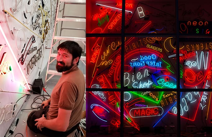 Not everything goes as planned while working with neon, and this was part of the inspiration behind Kenealey’s latest installation at the Emerick Art Studio. Titled “Amalgamated Neon Rescue” the installation features bits and pieces of neon that Kenealey was unable to use in his commercial work.