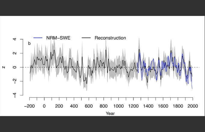 As explained in the article, “long-term records of snowpack prior to the installation of snowpack observation stations in the early and mid 20th century are limited.” The earliest data on these snow observations began around the 1930s, but tree ring reconstruction can go back 800 years to around 1200 C.E.