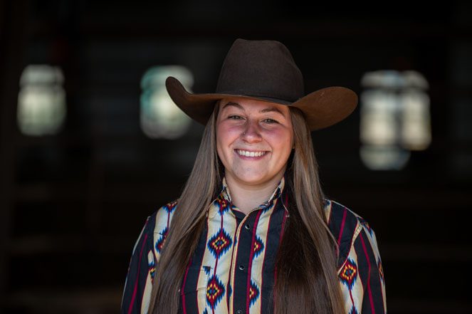 Gabriela Timmons is a Senior from Erie, Colorado and is pursuing degrees in Natural Horsemanship and Small Business Management. Gaby is a part of the Montana Western Fly-Fishing Club and loves baking, fishing, photography, hiking, and braiding reins. She is also Arc Welding Certified. Gaby prides herself on being an excellent gift giver. She hopes to be her own boss and run her own business. This is Gaby’s first year in sales prep, and she is riding {sorrel mare} donated by the Roaring Springs Ranch.