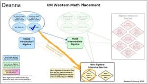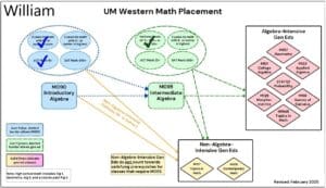 Meeting a blue prerequisite means you qualify to go directly into M 095 Intermediate Algebra. Meeting a green prerequisite means you qualify to go directly into a 100-level gen ed math course. Depending on your major, you might also consider the non-algebra-intensive pathway, keeping in mind that non-algebra-intensive gen eds do not count towards satisfying prerequisites for classes requiring M095. Talk to your advisor for more details.